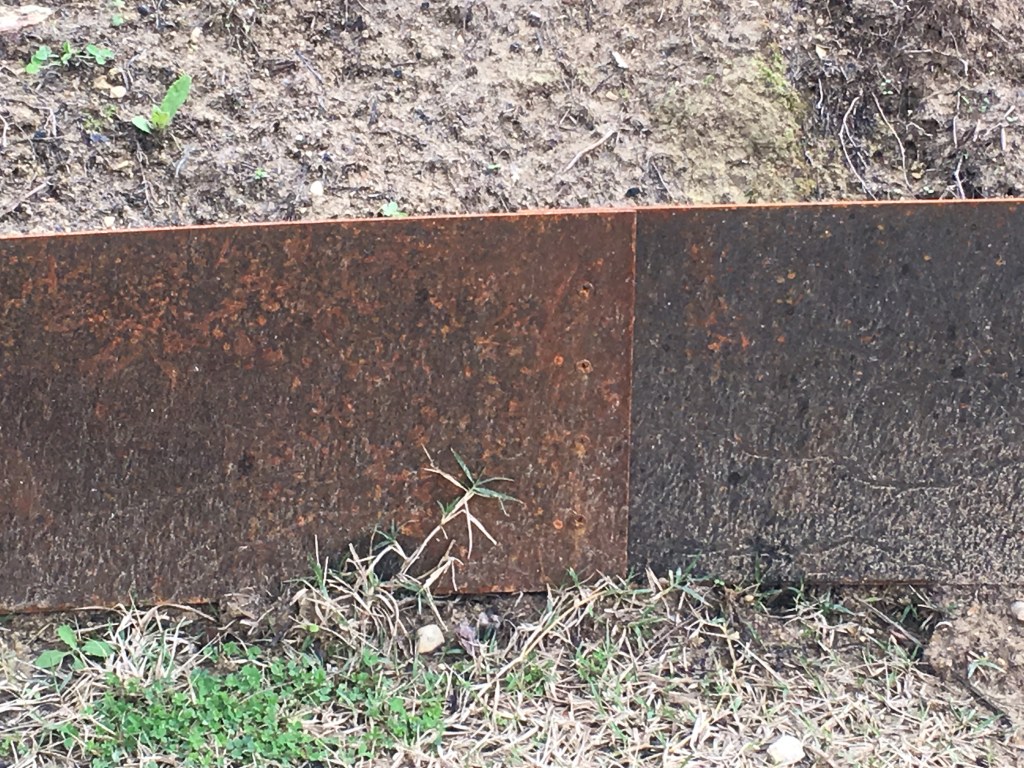 We spent two days fitting a 50m Cor-ten border between the garden and what will be gravel in front of the house. It took some doing to get the metal spikes through the soil full of genga (sand like stones that strenghthen when put under pressure), but we’re delighted with the result