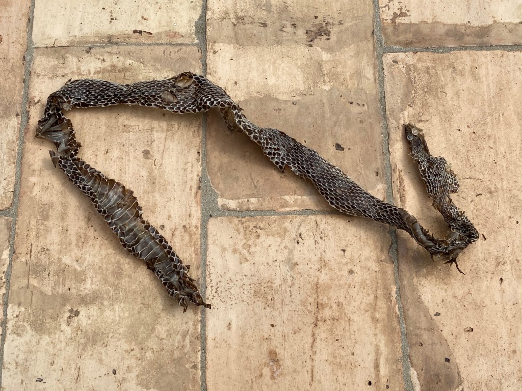 The shed roof blew off during the winter so we now have a very Italian style temporary solution; the hedge at the front had run wild so took hours to give to give it a hair cut; evidence of a snake making itself at home whilst we were away; a mountain of grass cuttings; the vines needed thinning to give the grapes more sunlight.