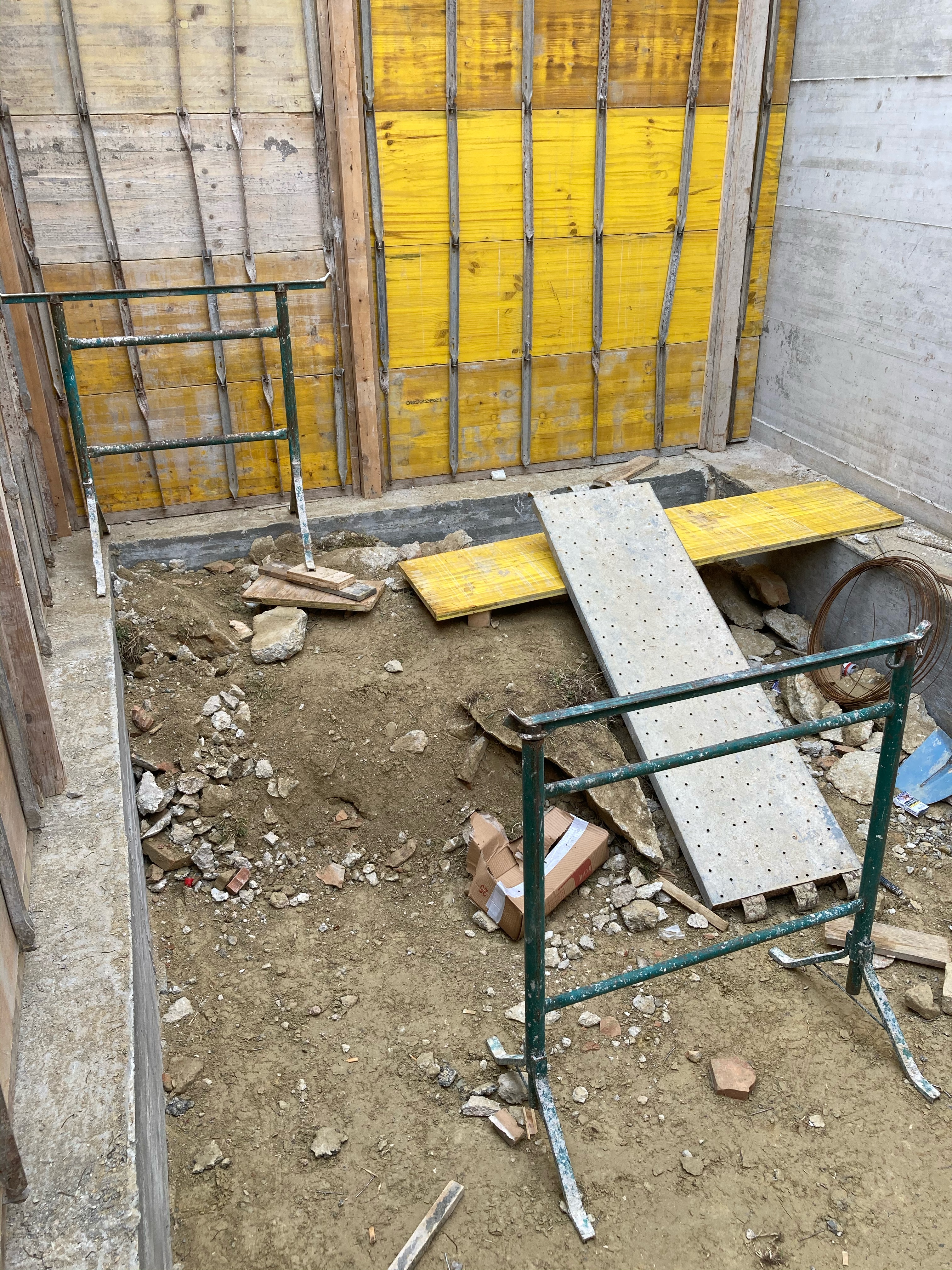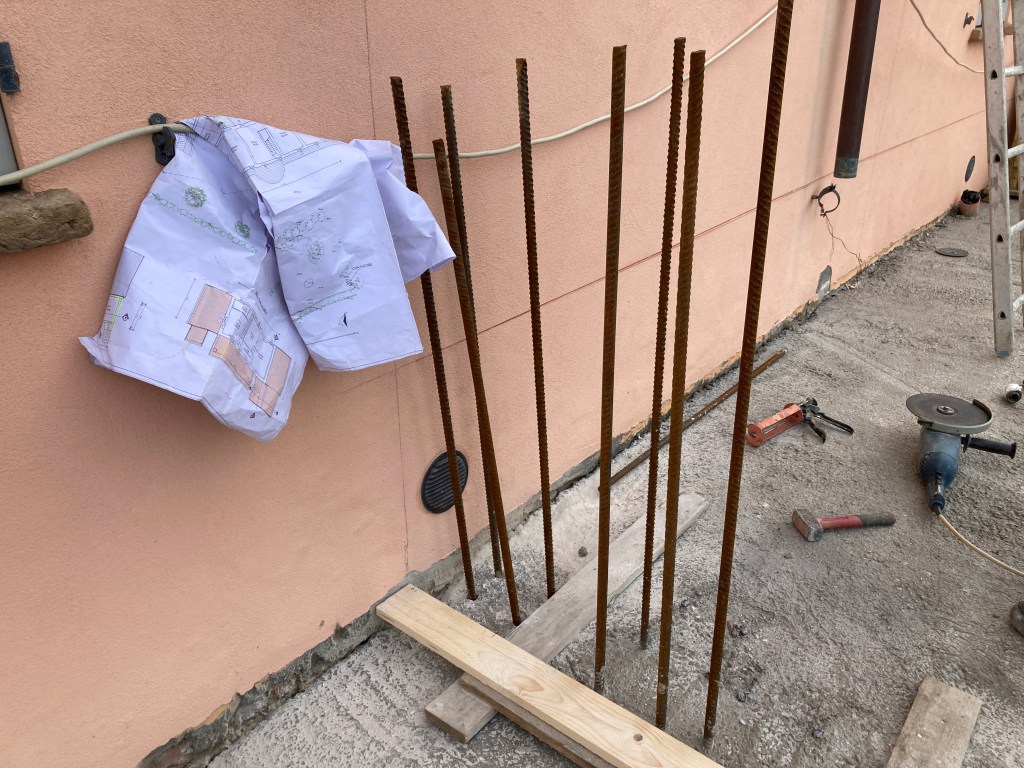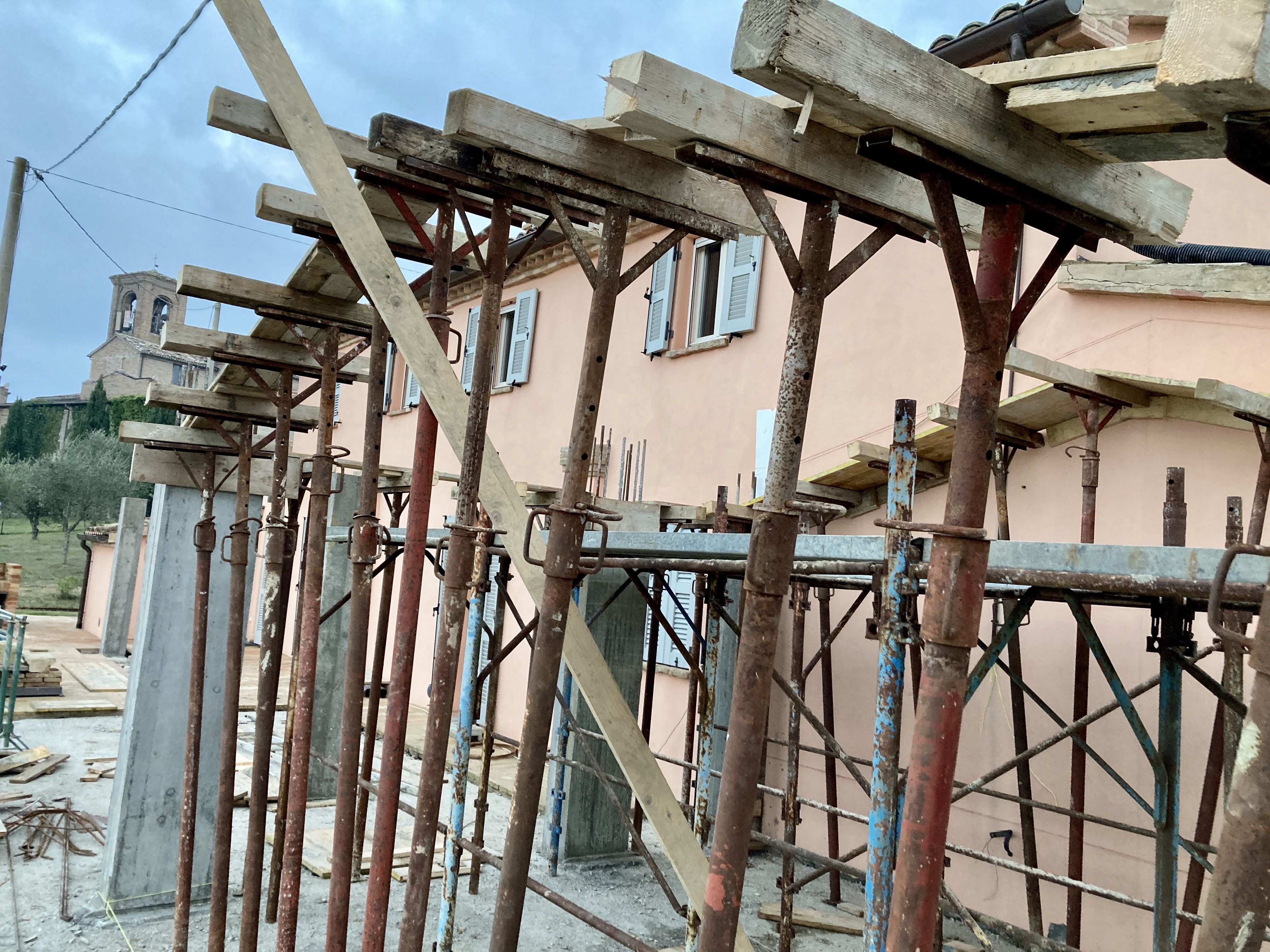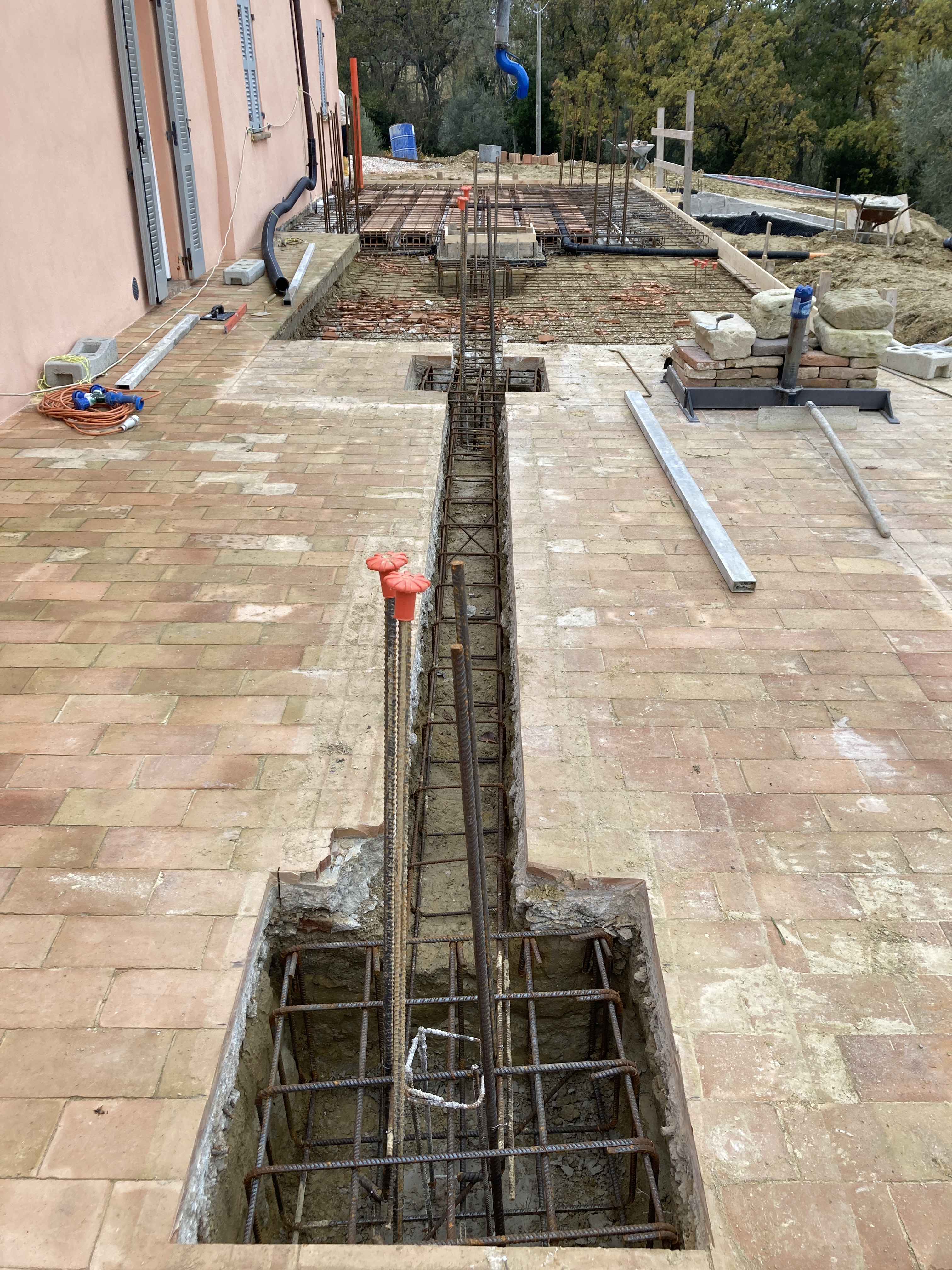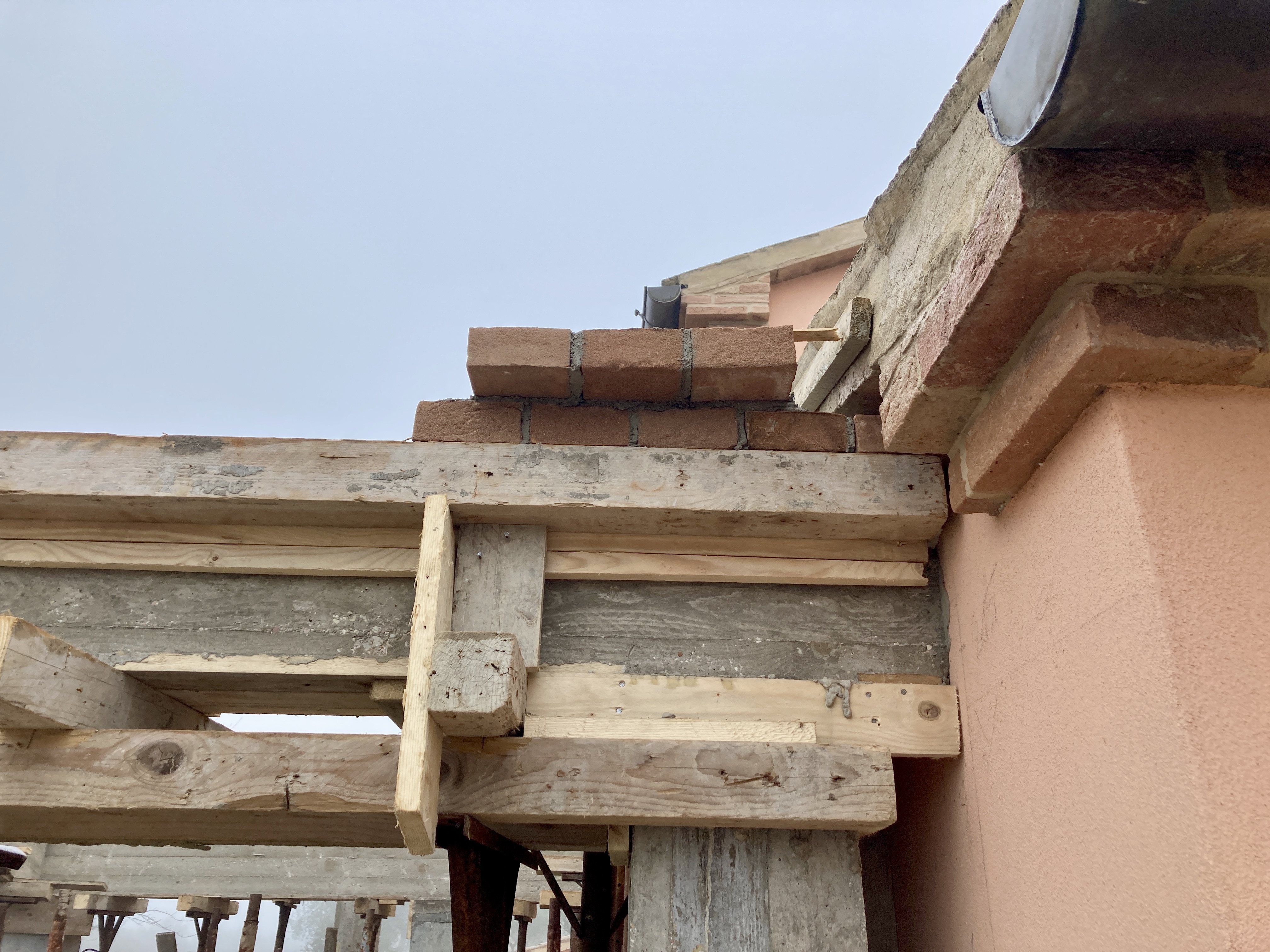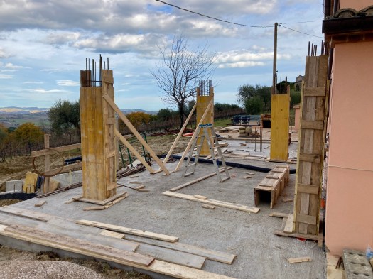This was a consequence of having to build the cantina 65cm further out that planned (remember our day 2 decision). No one spotted the consequence for the door. A good job we were paying attention. Gabriele took it all in his stride. He convened an onsite meeting between us, Sauro the geometra, and the engineer. We asked why a support pillar couldn’t be keyed into the house. It turned out that’s not possible as we’re in an earthquake zone. The two new structures have to move separately from the house. They came up with an alternative solution, to move the support pillar away from the house to allow room for the door. That was extra work of course.