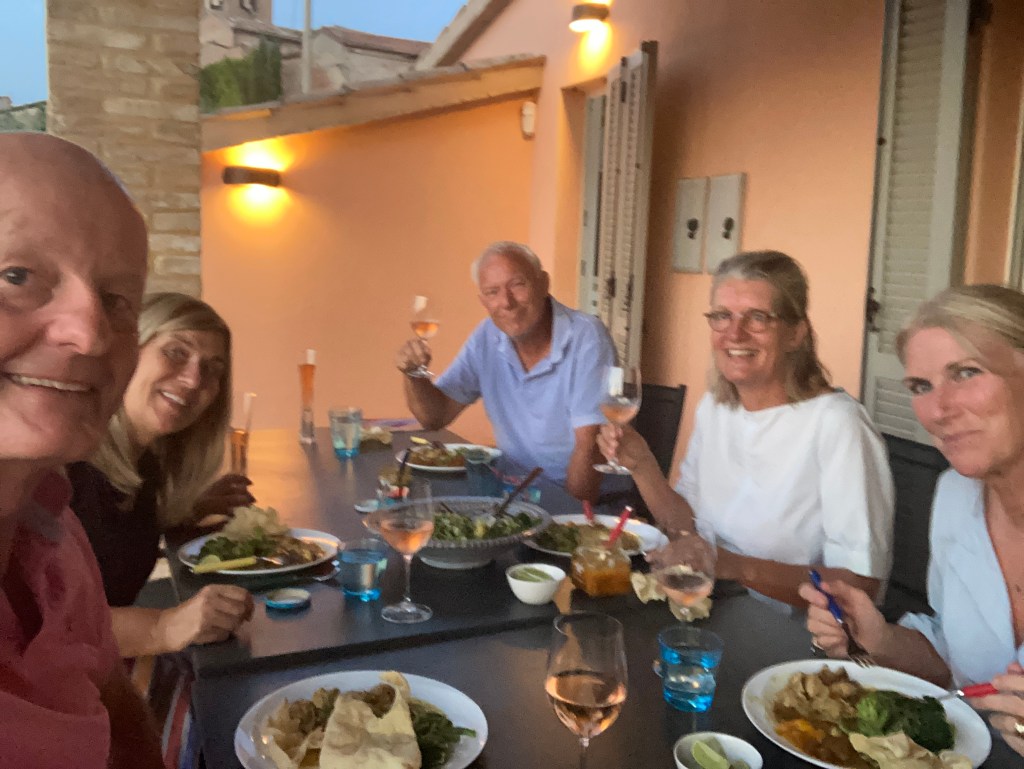 Whilst in London we watched some of the Euro2020 games in the pub. We were back in Italy for the final so began watching the game in Calcinelli with our Pansèr friends. After nearly 19 years of having a house here we had our first experience of being unwelcome. England scored first which, naturally, caused us to cheer. One local took great exception to this and got very aggressive. Gio Mare and Rodolfo Gasperini, both big blokes, kept him at bay. We decided that it would be better for everyone if we left. Such a shame as we’d been enjoying some fun banter with the young lads in front of us, in fact they asked us to stay. Even more so that Colin wore and England shirt and Jan an Italian shirt to show our support for both teams. Our friend Fiorenzo showed the proper spirit of the evening by being proud of this photo and sending it round to his friends.
